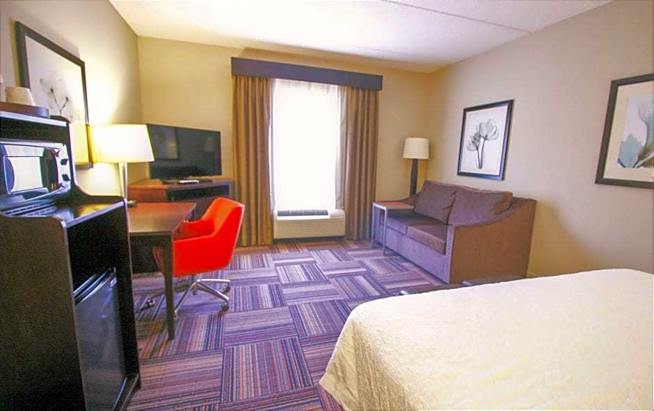 This room features a seating area with an ottoman, 32-inch flat-screen cable TV, and sofa bed. A desk is also included.